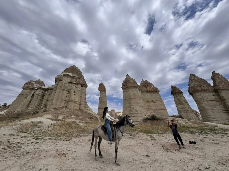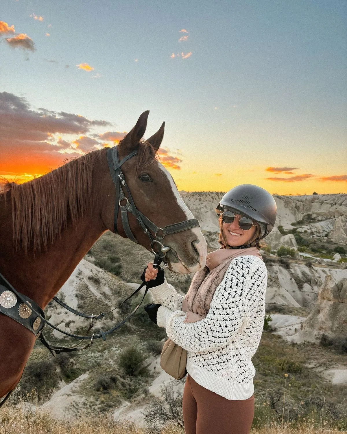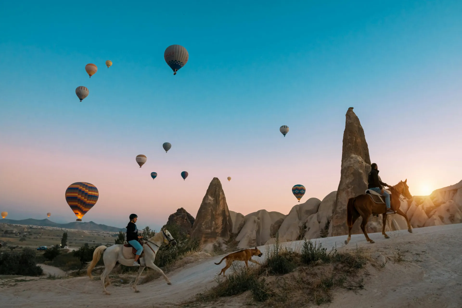 Descubra o Vale do Amor a cavalo — ao amanhecer ou ao pôr-do-sol. De manhã, espera-o um espetáculo mágico com balões de ar quente e uma luz suave; à noite, as cores quentes do pôr-do-sol e a atmosfera tranquila do vale.